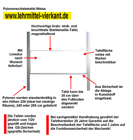 Ausgestattet sind diese Tafeln serienmäßig an der mittleren Schreibfläche mit einer großen Ablage aus natureloxiertem Aluminium. Die Ablage hat aus Sicherheitsgründen Kunststoffschutzkappen. Zur Ausstattung der Tafelfläche gehört eine in das Rahmenprofil integrierte Schmutzauffangrinne aus natureloxiertem Aluminium, deren abgerundete Kunststoffschutzkappen grau sind. Die Tafeloberfläche, ist auch mit einer anderen Emailbeschichtung auf Nachfrage lieferbar. Die Wandmontage der Tafeln erfolgt wird durch ein 50mm Roheisen welches an die 100x100 mm Pylonen angebracht wird. Der Wandabstand ist dann ca 150 mm. Durch Wandabstandshalter können auch andere Wandabstände eingehalten werden. Hinweis: Die max zu vereinbarende Pylonenhöhe ist Raumhöhe abzgl 100 mm. Die Tafeloberfläche aus Stahlblech ist magnethaftend, stoß- und bruchfest. Durch ein spezielles Einbrennverfahren des Emailpulvers in grün, blau oder weiß bei 600° bis 800° ist die Tafeloberfläche kratzsicher und blendfrei. Gesonderte Emailbeschichtung ist auf Nachfrage möglich. Die grüne und blaue Tafelfläche ist mit Kreide beschreibbar und nass abwischbar, die Whiteboardfläche ist mit Boardmarkern beschreibbar und trocken abwischbar. Das Tafelblatt besteht aus einem 19,5 mm starken Hartschaumkern, wasserabweisend (DIN 18164) und schwer entflammbar (DIN 4102). Die Schreibfläche ist ein 0,6 mm starkes, verzinktes Stahlblech mit einer emailbeschichteten Oberfläche, serienmäßig grün. Die Rückseite ist ein 0,5 mm starkes, verzinktes Stahlblech und wird gegen den Hartschaumkern kaschiert. Die schraubenlose Rahmeneinfassung des Tafelblattes mit einem natureloxierten, abgerundeten Aluminium- Hohlkammerprofil schützt den Tafelkern vor Feuchtigkeit. Die integrierten, abgerundeten Tafelecken aus grauem Kunststoff dienen der Sicherheit. Die Montage des Tafelblattes in Sandwich- oder Leichtbauweise hat ihren Nutzen im geringen Tafelgewicht von unter 10 kg/m2, damit ist das Tafelblatt für die Federzugmechanik geeignet. Alle verwendeten Klebstoffe sind frei von Lösungsmitteln und wurden speziell für uns entwickelt. Alu-Profile, serienmäßig natureloxiert, sind auf Nachfrage mit einer Farbbeschichtung nach RAL lieferbar. Lineaturen werden nur auf Bestellung geliefert. Bei sachgemäßer Handhabung gewähren wir 20 Jahre Garantie auf die Beschreibbarkeit der Tafelfläche und 3 Jahre auf die Funktionssicherheit der Mechanik. Unsere Tafeln werden seit über 15 Jahren jährlich vom TÜV geprüft und tragen seitdem das GS Zeichen.