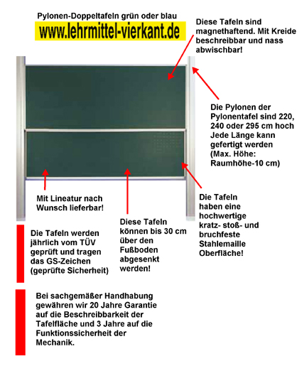 Die Tafeloberfläche aus Stahlblech magnethaftend, stoß- und bruchfest. Durch ein spezielles Einbrennverfahren des Emailpulvers in grün, blau oder weiß bei 600° bis 800° ist die Tafeloberfläche kratzsicher und blendfrei. Gesonderte Emailbeschichtung ist auf Nachfrage möglich. Die grüne und blaue Tafelfläche ist mit Kreide beschreibbar und nass abwischbar, die weiße Tafelfläche ist mit Boardmarker beschreibbar und trocken abwischbar. Das Tafelblatt besteht aus einem verwindungssteifen, wölbungsfreien und wärmeunempfindlichen Wabenkern (15 mm) mit beidseitiger Stahlblechauflage (0,5 mm). Diese Tafeln haben ein Rahmenprofil ( WKSS-Profil) mit integrierter Stiftablageleiste zur zusätzlichen Stabilisierung und Versteifung der Tafelbreite. Ab Tafelbreite 400 cm bringen wir zusätzlich einen Längsstabilisator zur Vermeidung von Schwingungen und Zug. Diese Tafeln haben einen umlaufende Alu-Rahmen 16 mm mit dem Tafelblatt wasserdicht verklebt dazu abgerundete Kunststoffecken. Diese Tafeln sind schwer entflammbar (DIN 4102). Eloxierte Pylonen im Quadrat BxT 95x95 mm mit kugelgelagerte Laufrollen. Alu-Profile, serienmäßig natureloxiert, sind auf Nachfrage mit einer Farbbeschichtung nach RAL lieferbar. Lineaturen werden nur auf Bestellung geliefert.